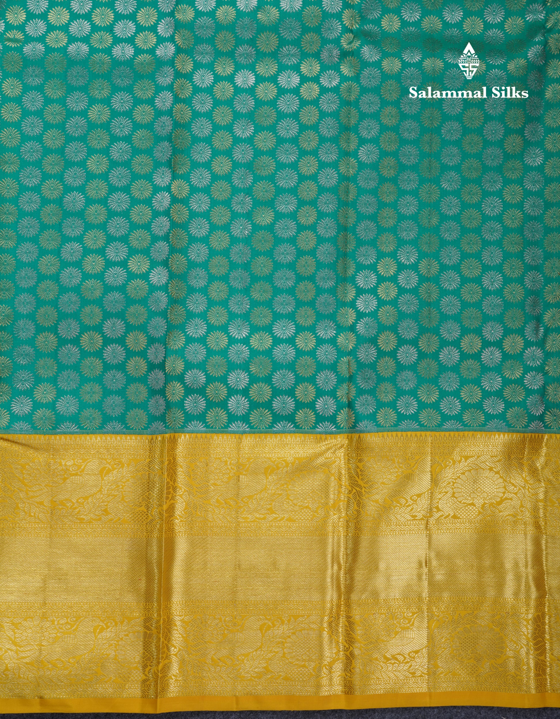 Saffire Green Bridal Pure Kanjivaram Silk Saree With Contrast Yellow Traditional Evening Morning Border