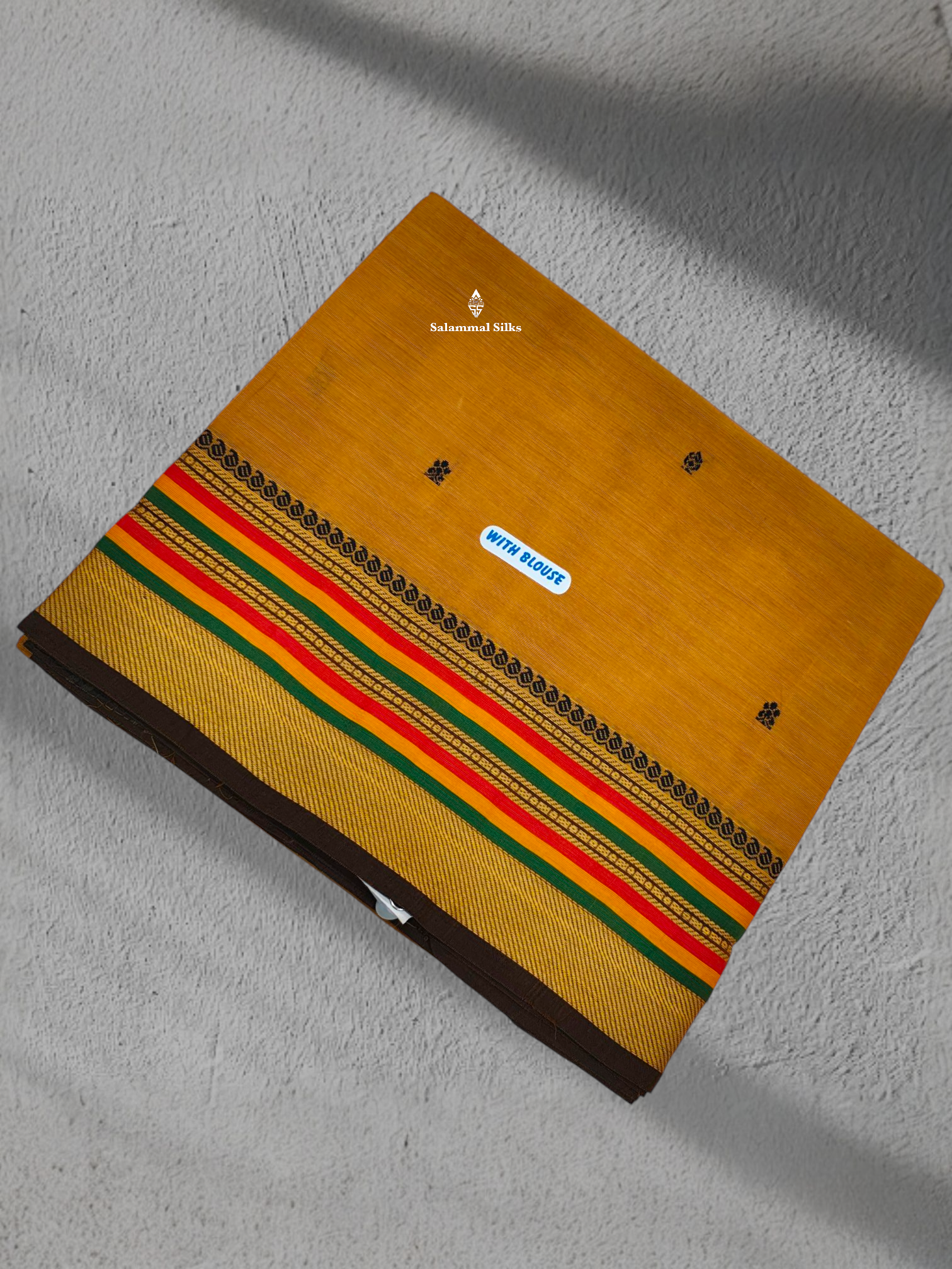 Salammal is known for its handloom sarees. In some sarees, there is cross-weaving between the body and the pallu, which is a sign of pure handloom sarees. This can be seen in Kanchipuram embossed sarees.