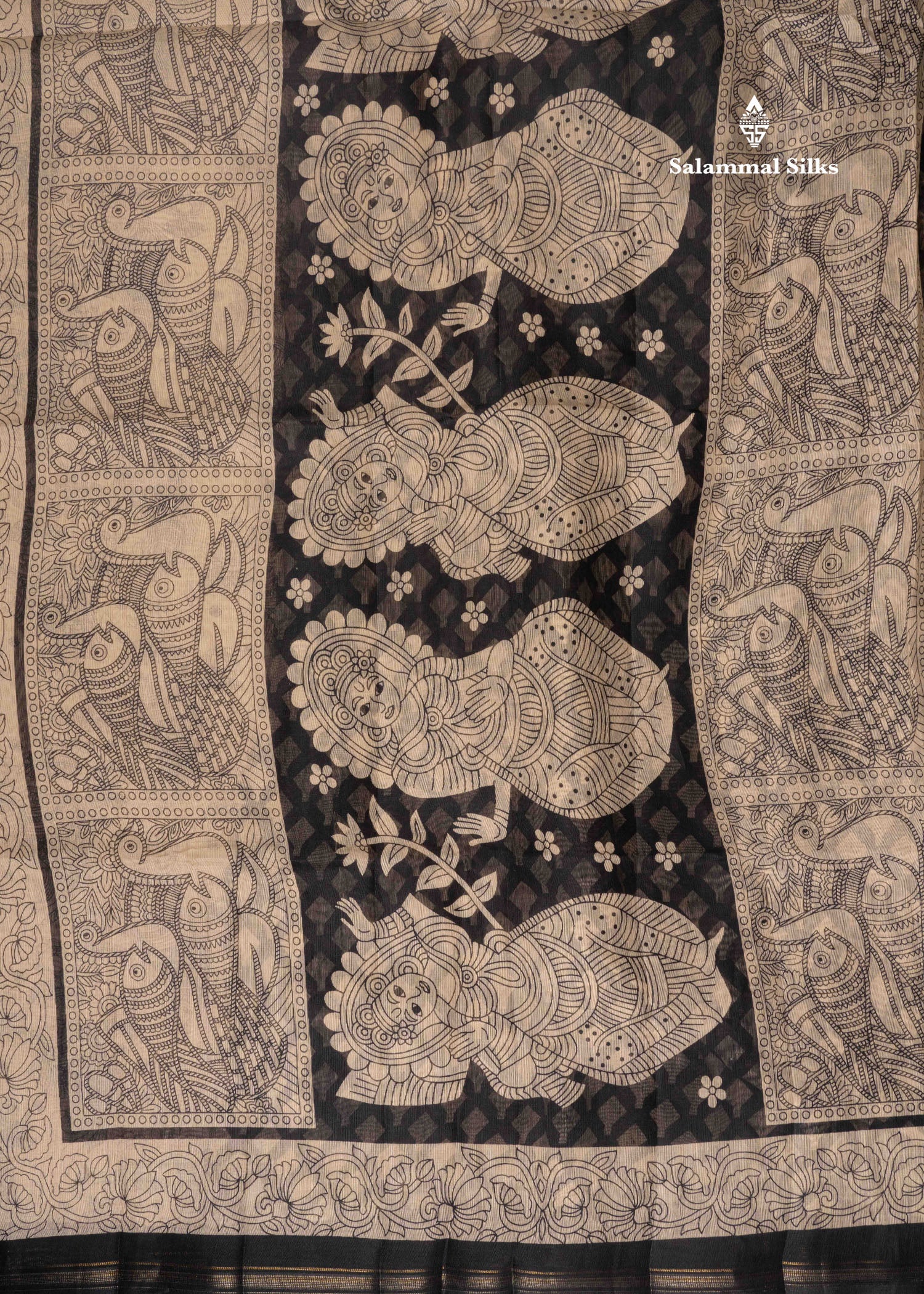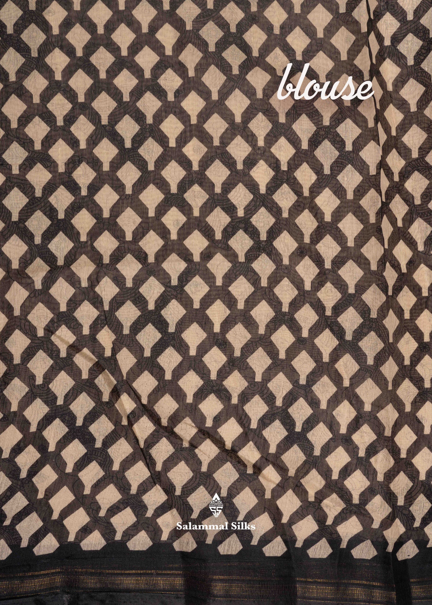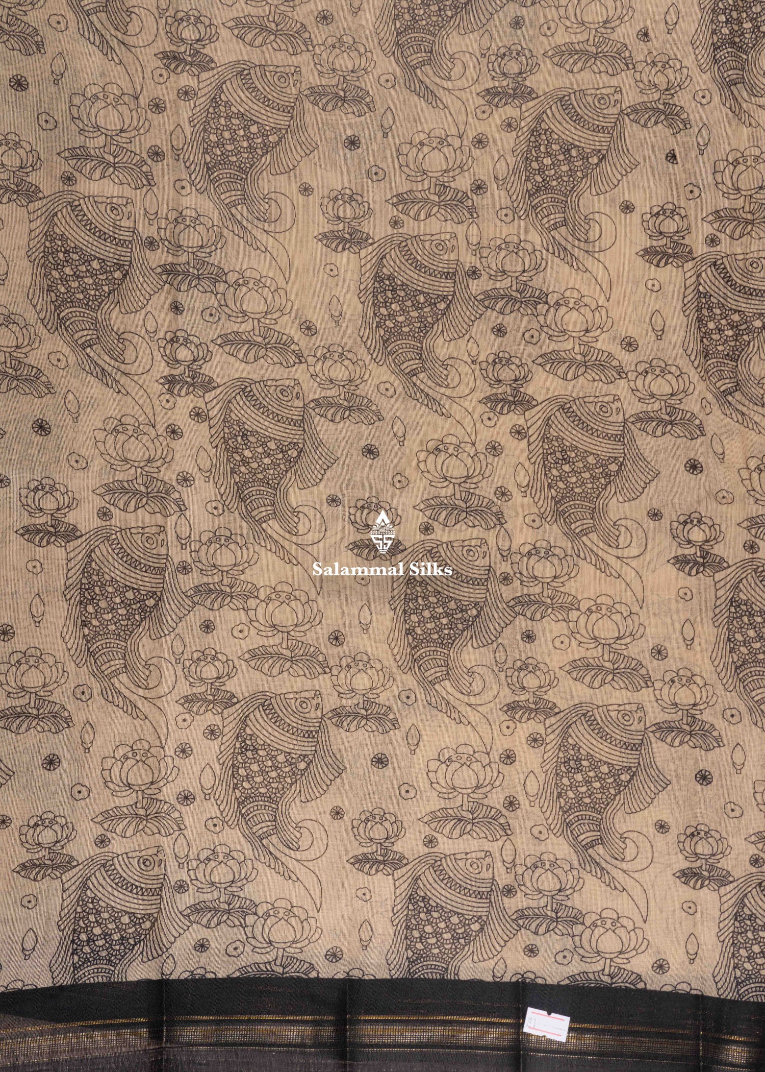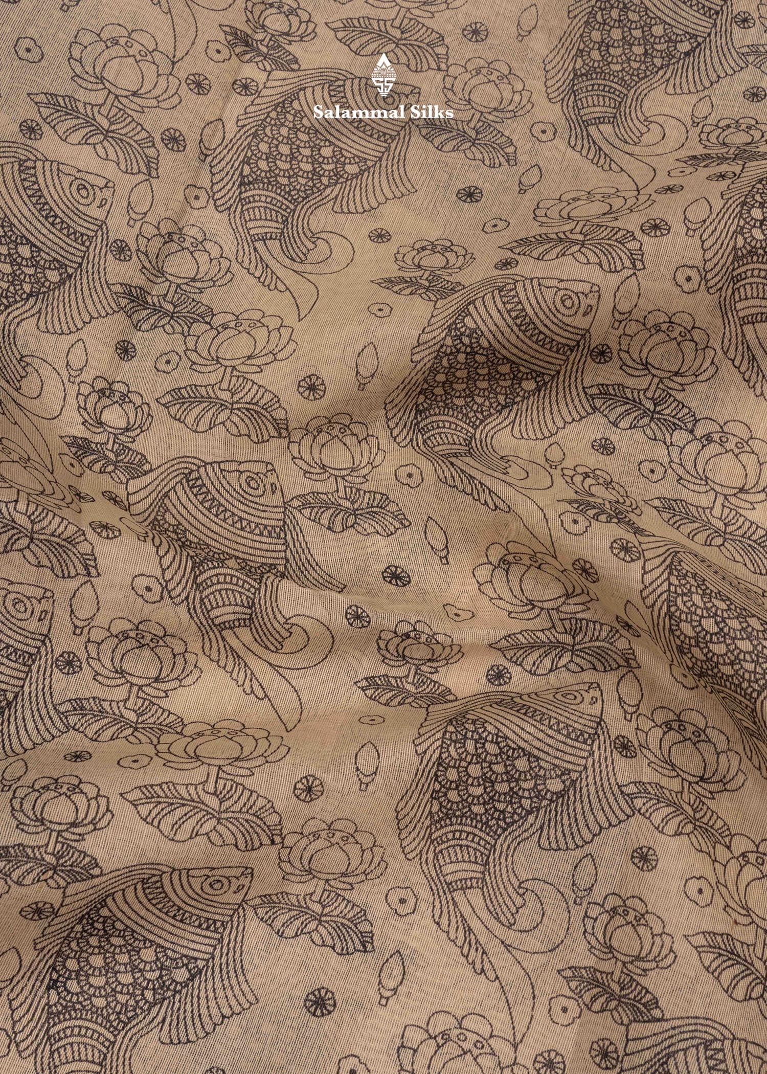 Sandal Colour Fish Print Linen Mix Saree With Black Blouse