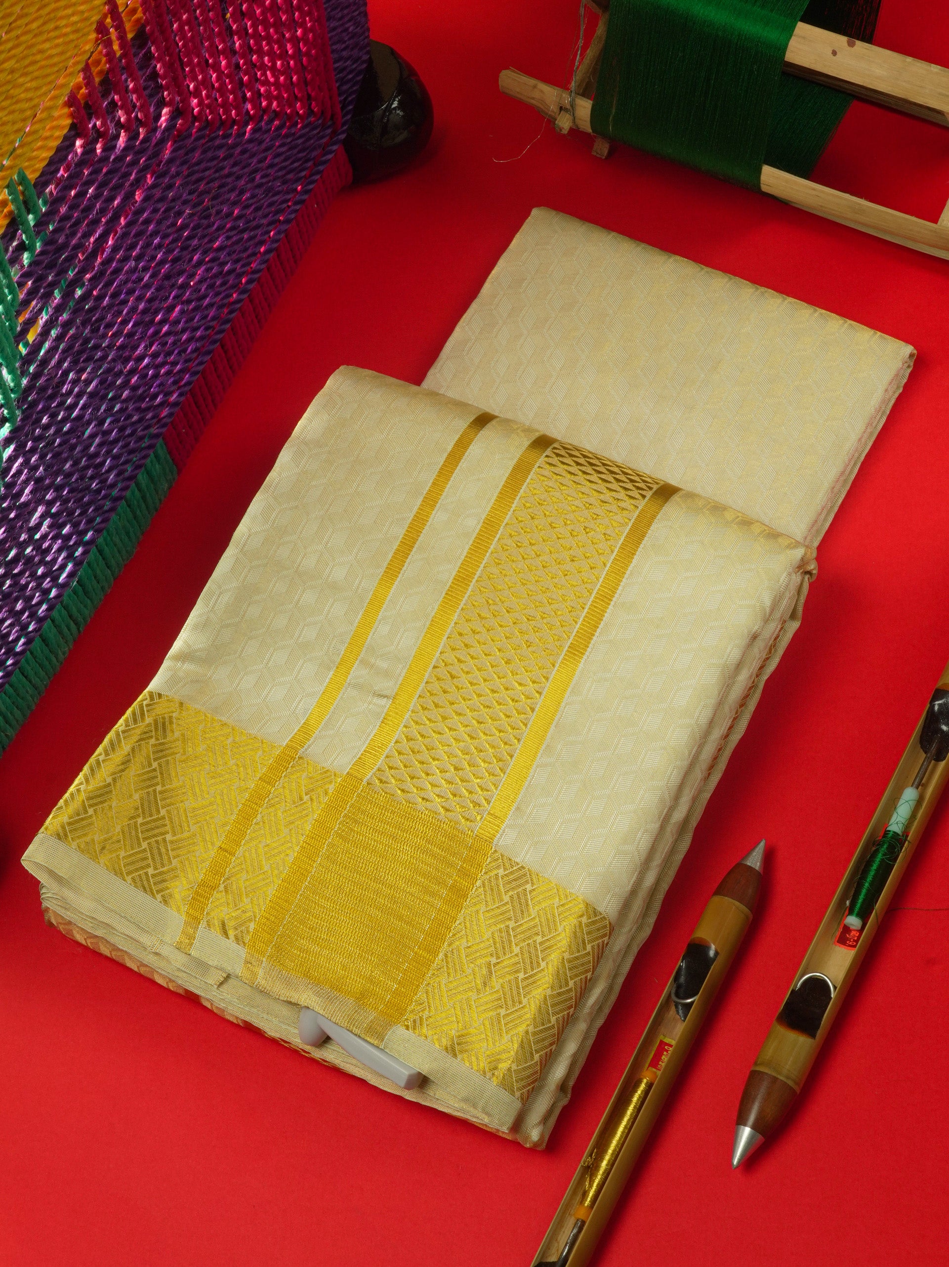 Sandal Colour Pure Silk 9 Yards Dhoti, 5 Yards Angavastram & Shirt Bit (2.50M) with Gold Zari Border