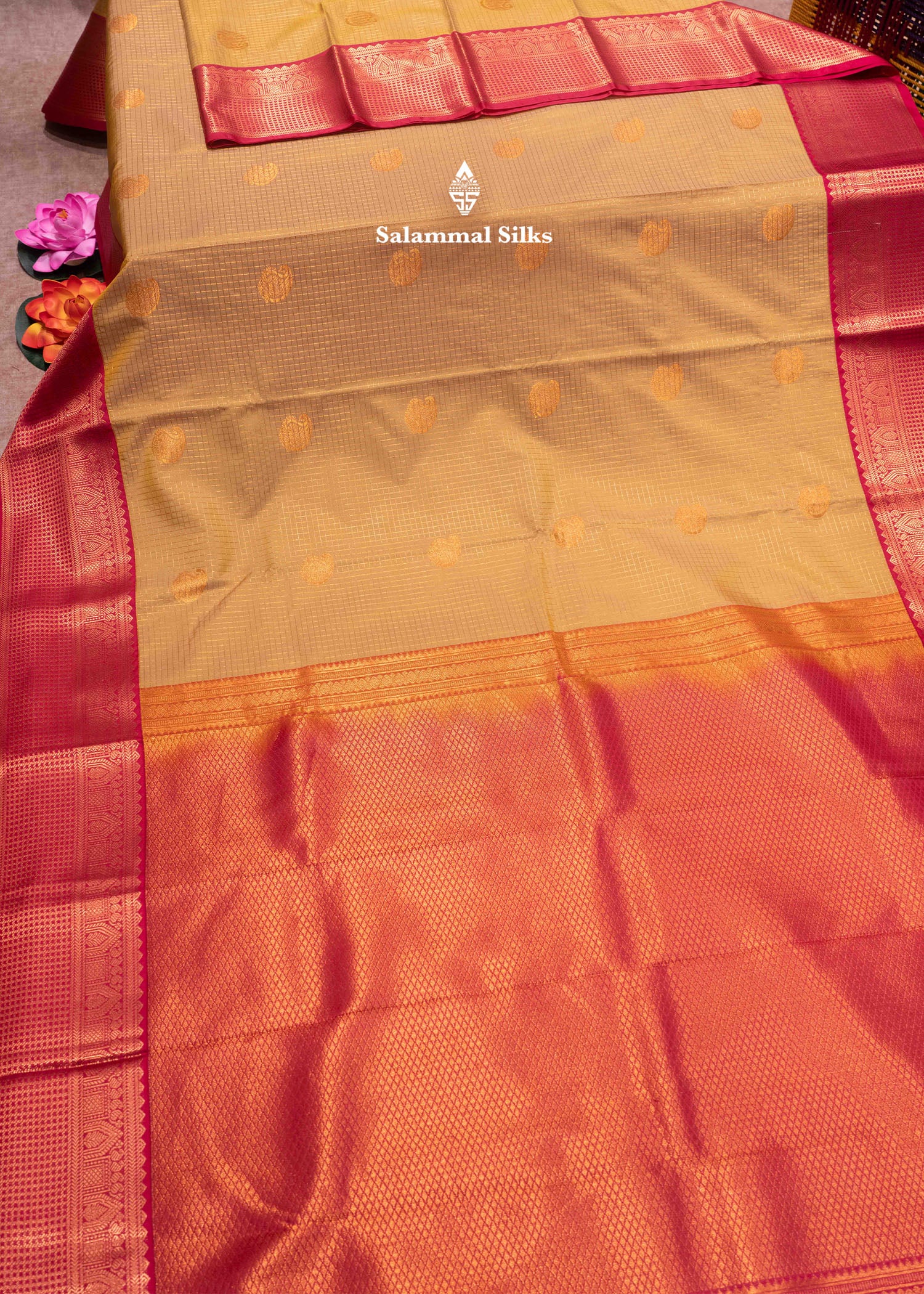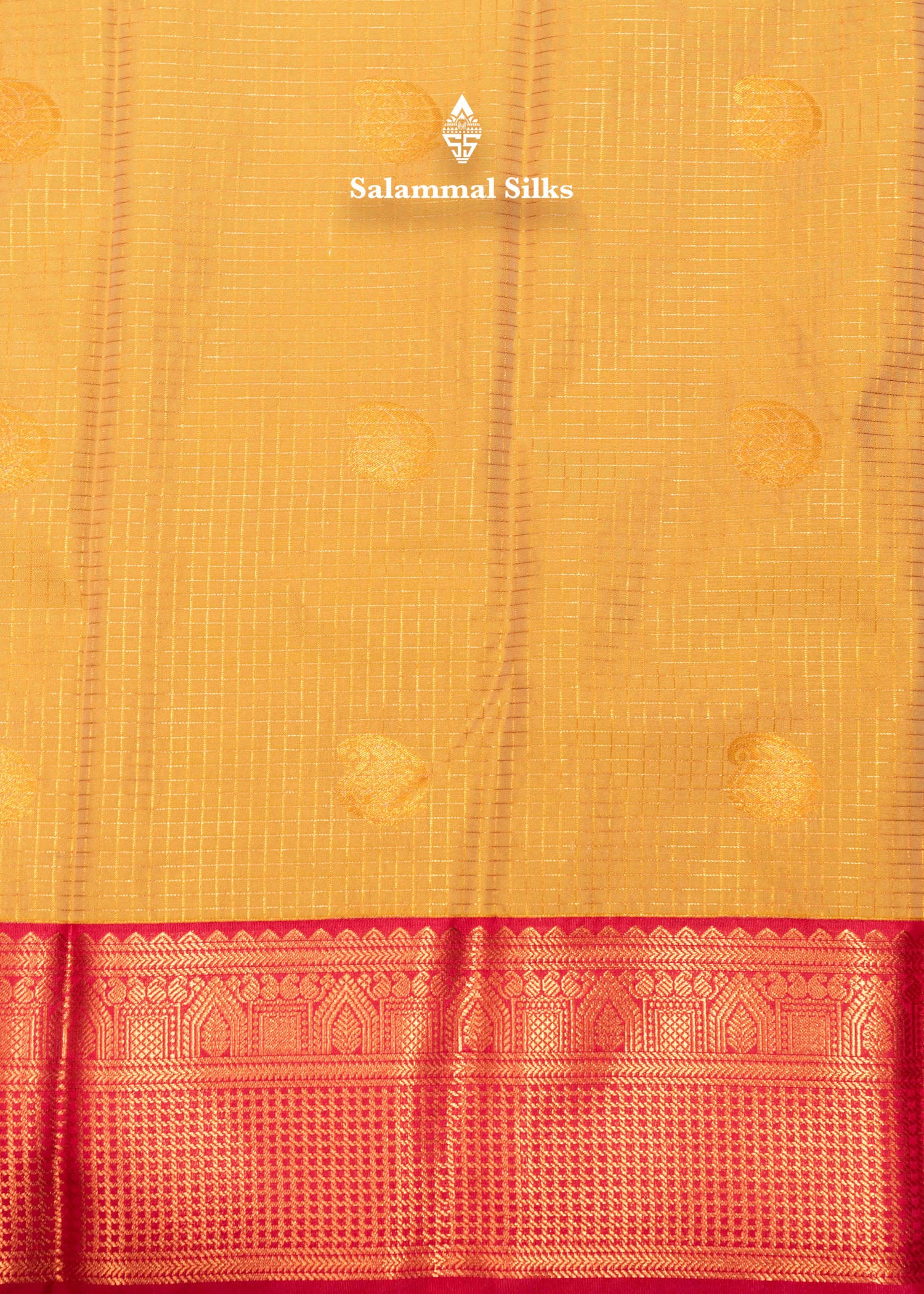 Salammal is known for its handloom sarees. In some sarees, there is cross-weaving between the body and the pallu, which is a sign of pure handloom sarees. This can be seen in Kanchipuram embossed sarees.