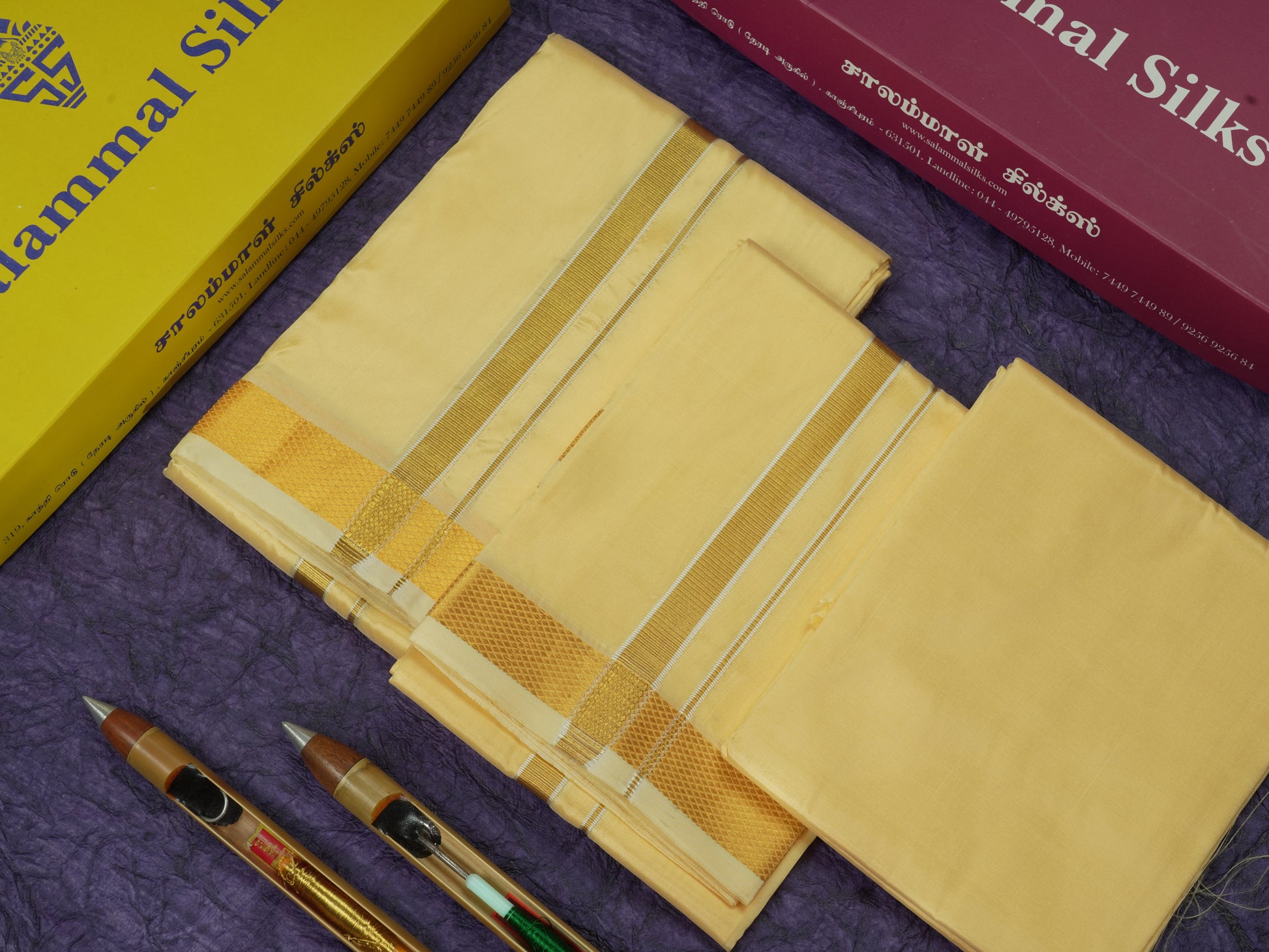 Sandal Semi Silk Dhoti, Angavastram & Shirt (2.50M) with Gold Zari Border