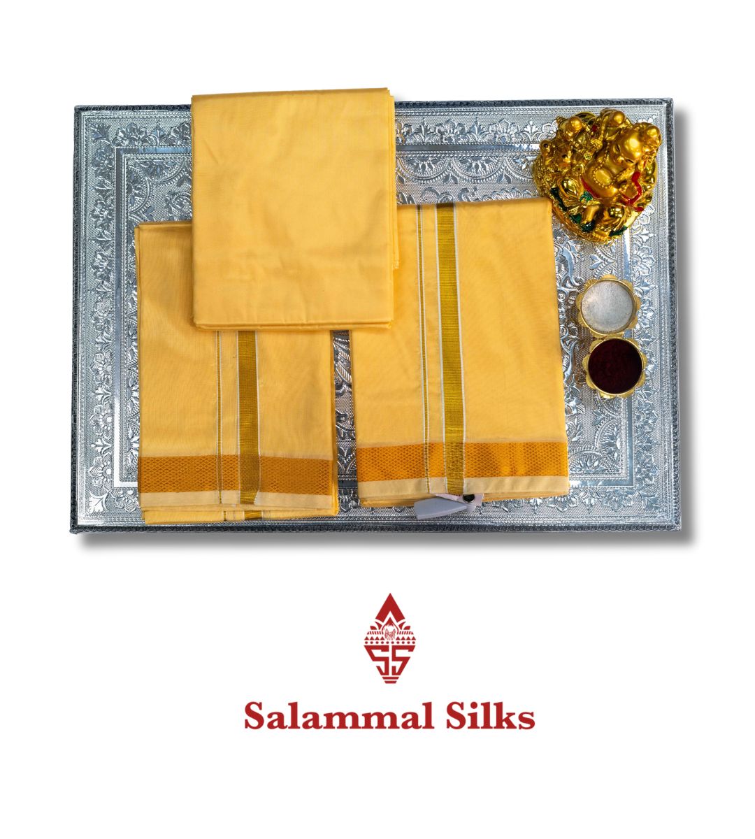 Sandal Semi Silk Dhoti, Angavastram & Shirt (2.50M) with Gold Zari Border