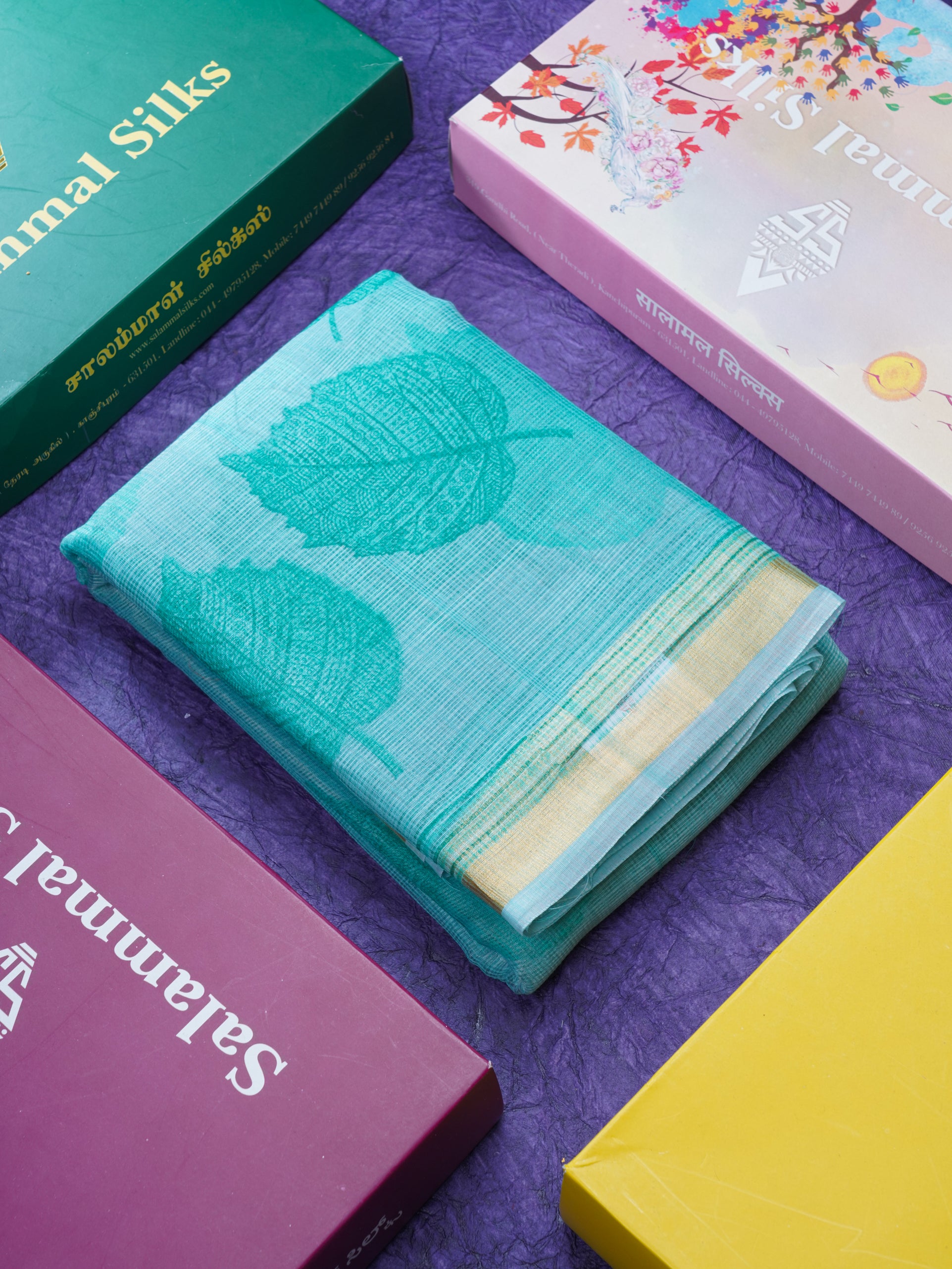 Salammal is known for its handloom sarees. In some sarees, there is cross-weaving between the body and the pallu, which is a sign of pure handloom sarees. This can be seen in Kanchipuram embossed sarees.