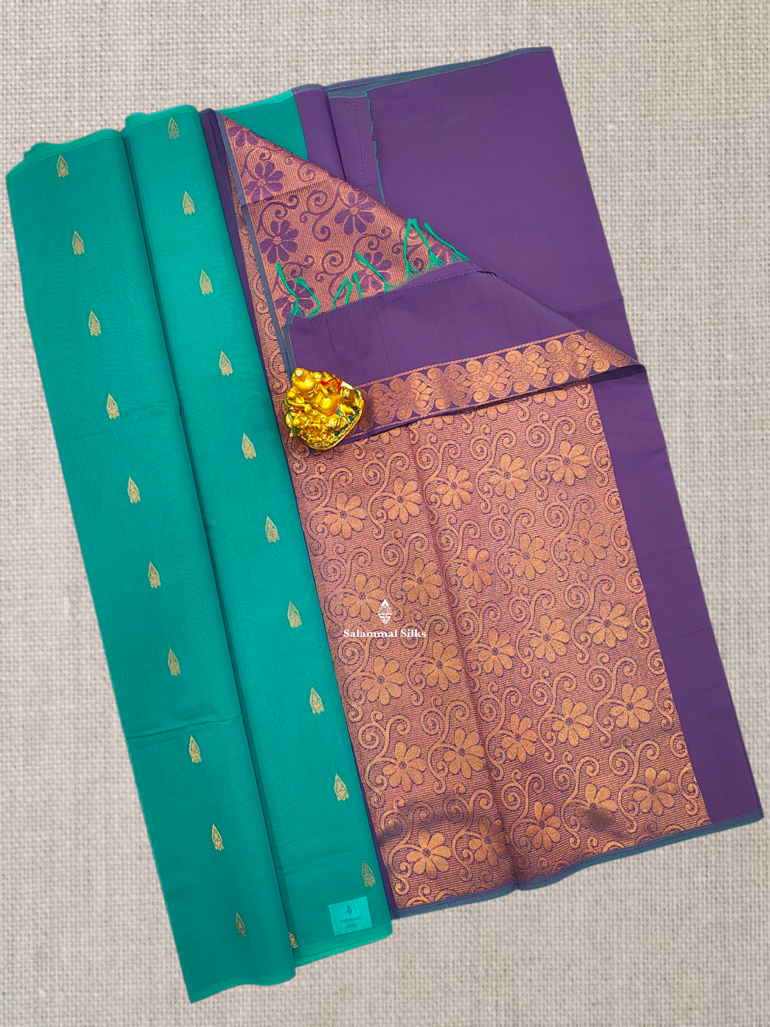 Salammal is known for its handloom sarees. In some sarees, there is cross-weaving between the body and the pallu, which is a sign of pure handloom sarees. This can be seen in Kanchipuram embossed sarees.