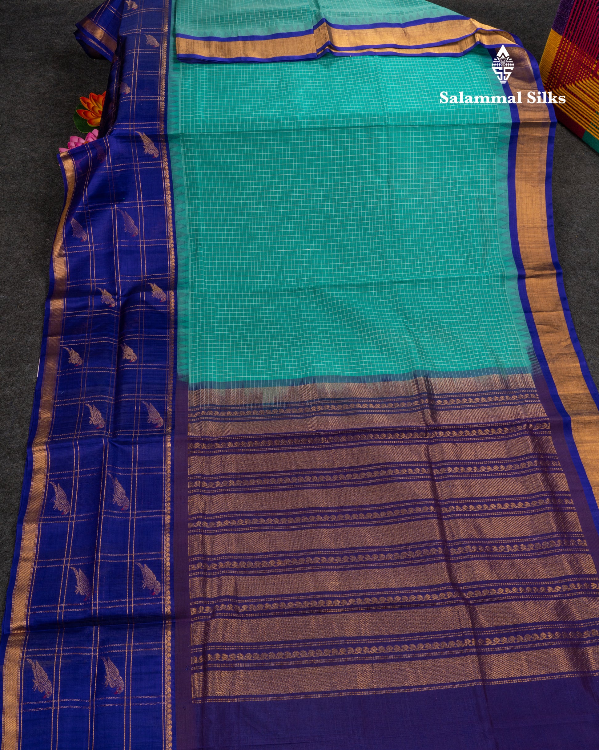 Sapphire Green Small Checks Pure Silk Cotton Saree With Contrast Long Violet Border & Parrot Motifs