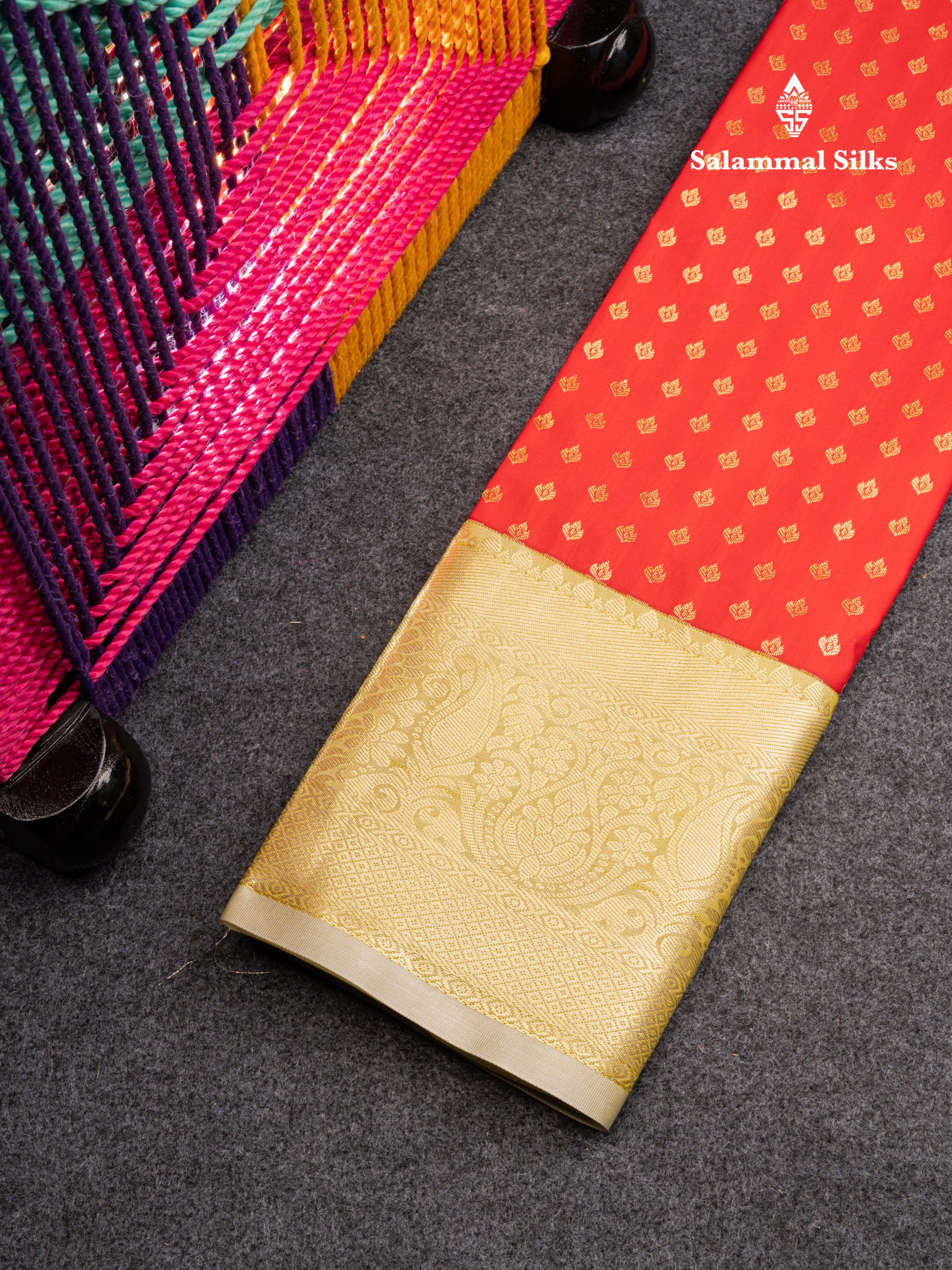 Salammal is known for its handloom sarees. In some sarees, there is cross-weaving between the body and the pallu, which is a sign of pure handloom sarees. This can be seen in Kanchipuram embossed sarees.
