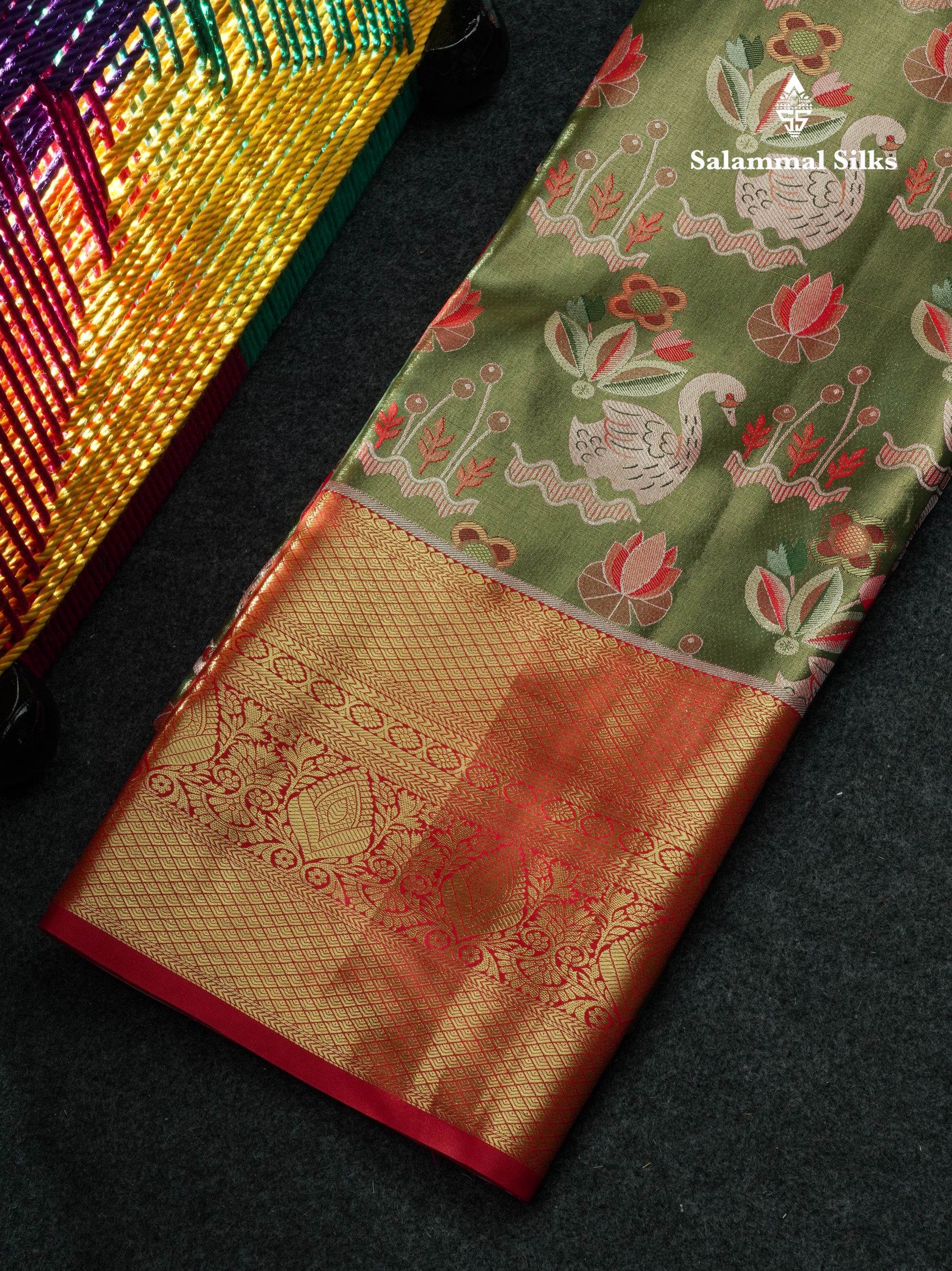 Semi Silk Pattu Pavadai Tissue (Army Green) With Red Blouse 44"