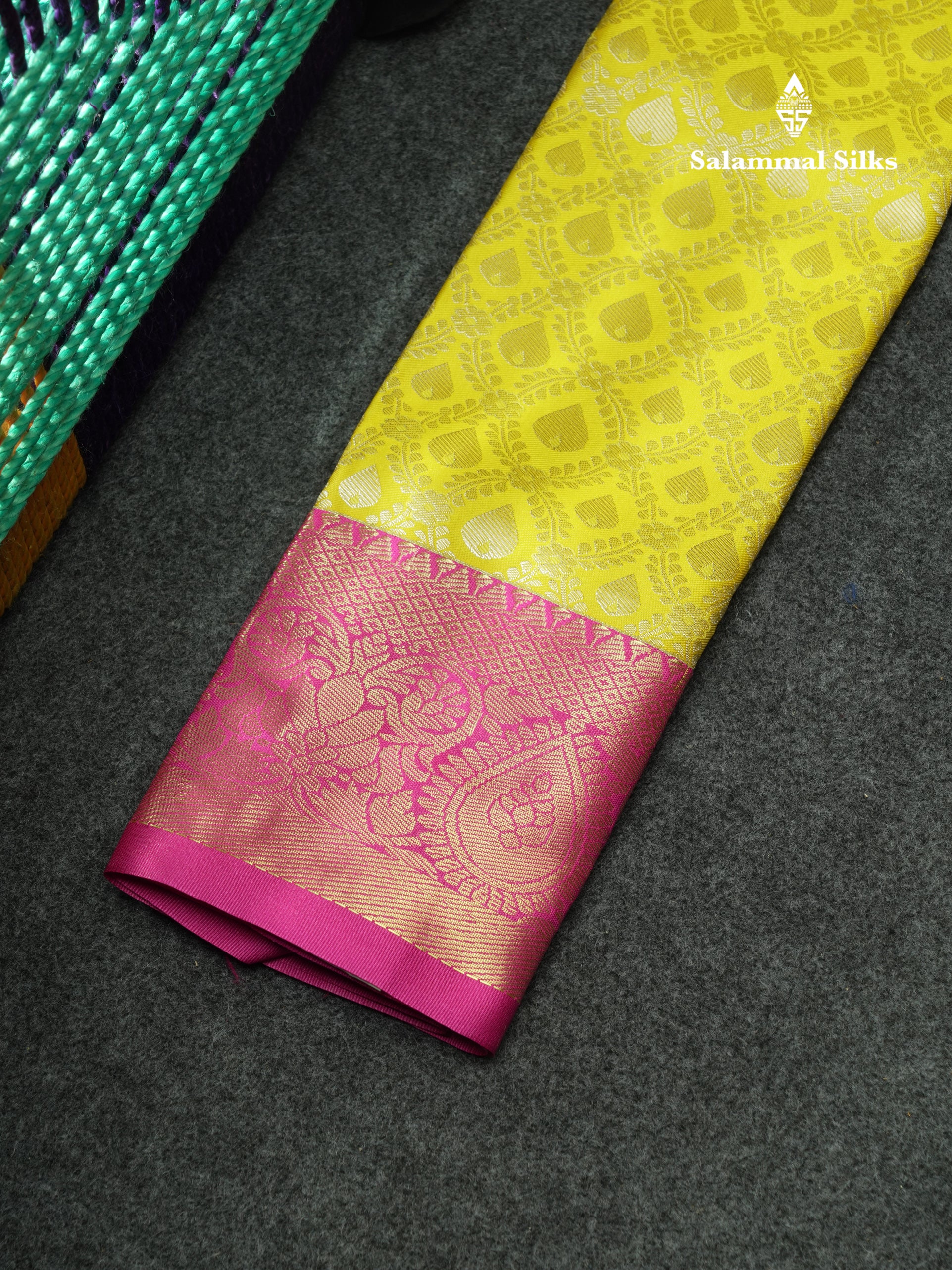 Salammal is known for its handloom sarees. In some sarees, there is cross-weaving between the body and the pallu, which is a sign of pure handloom sarees. This can be seen in Kanchipuram embossed sarees.