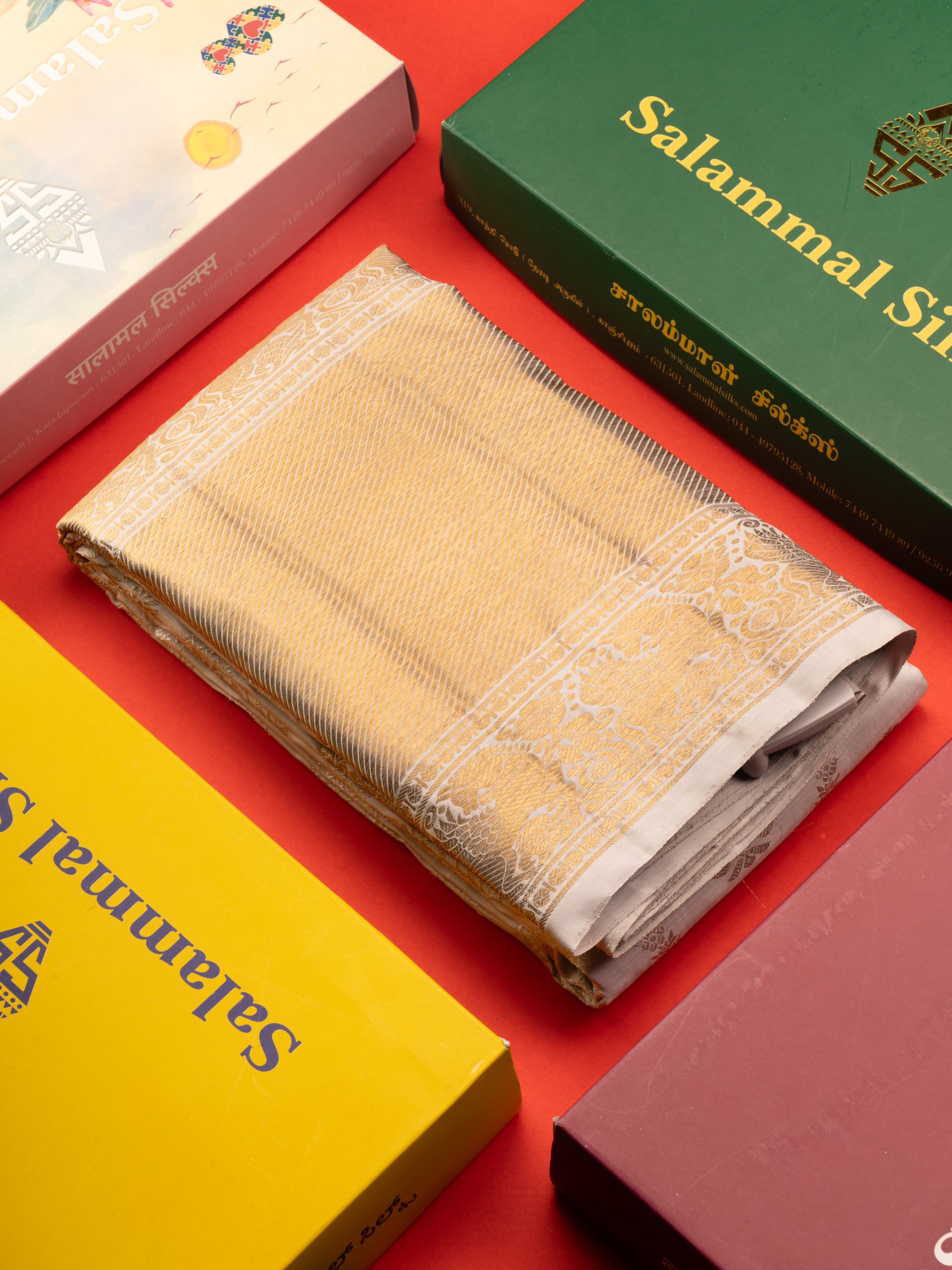 Salammal is known for its handloom sarees. In some sarees, there is cross-weaving between the body and the pallu, which is a sign of pure handloom sarees. This can be seen in Kanchipuram embossed sarees.
