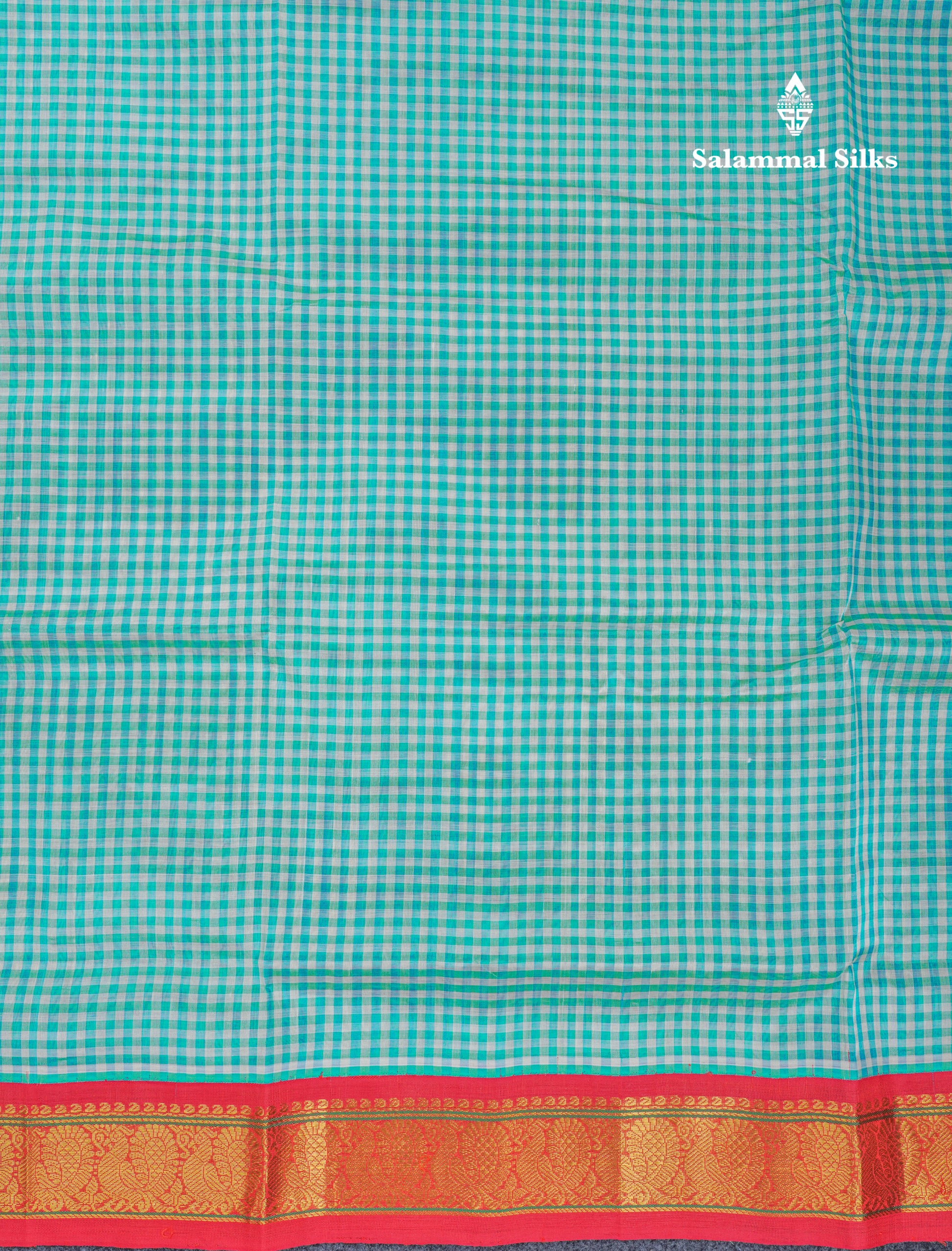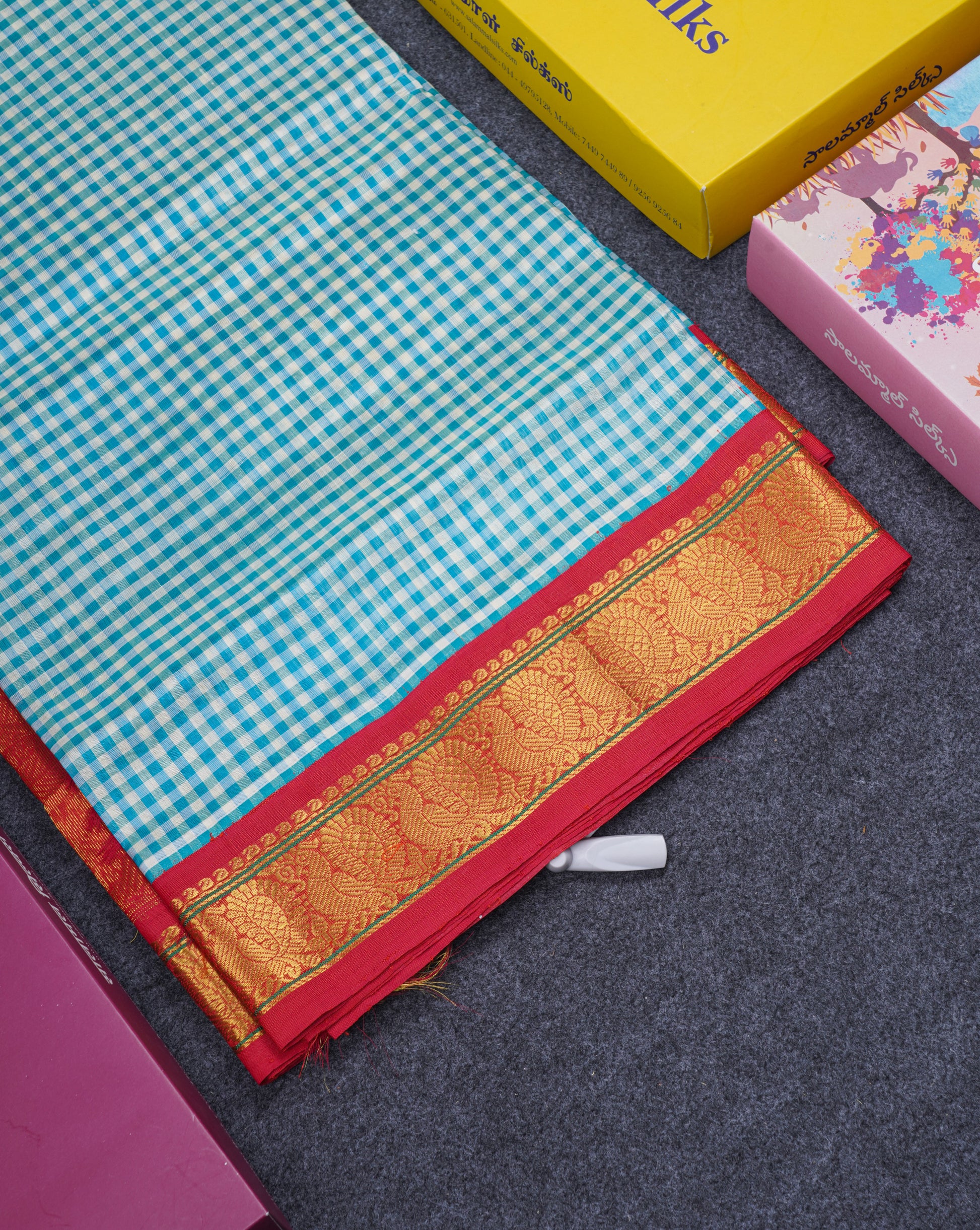 Sky Blue & White Tiny Checks Pure Silk Cotton Saree With Contrast Chilly Red Traditional Border