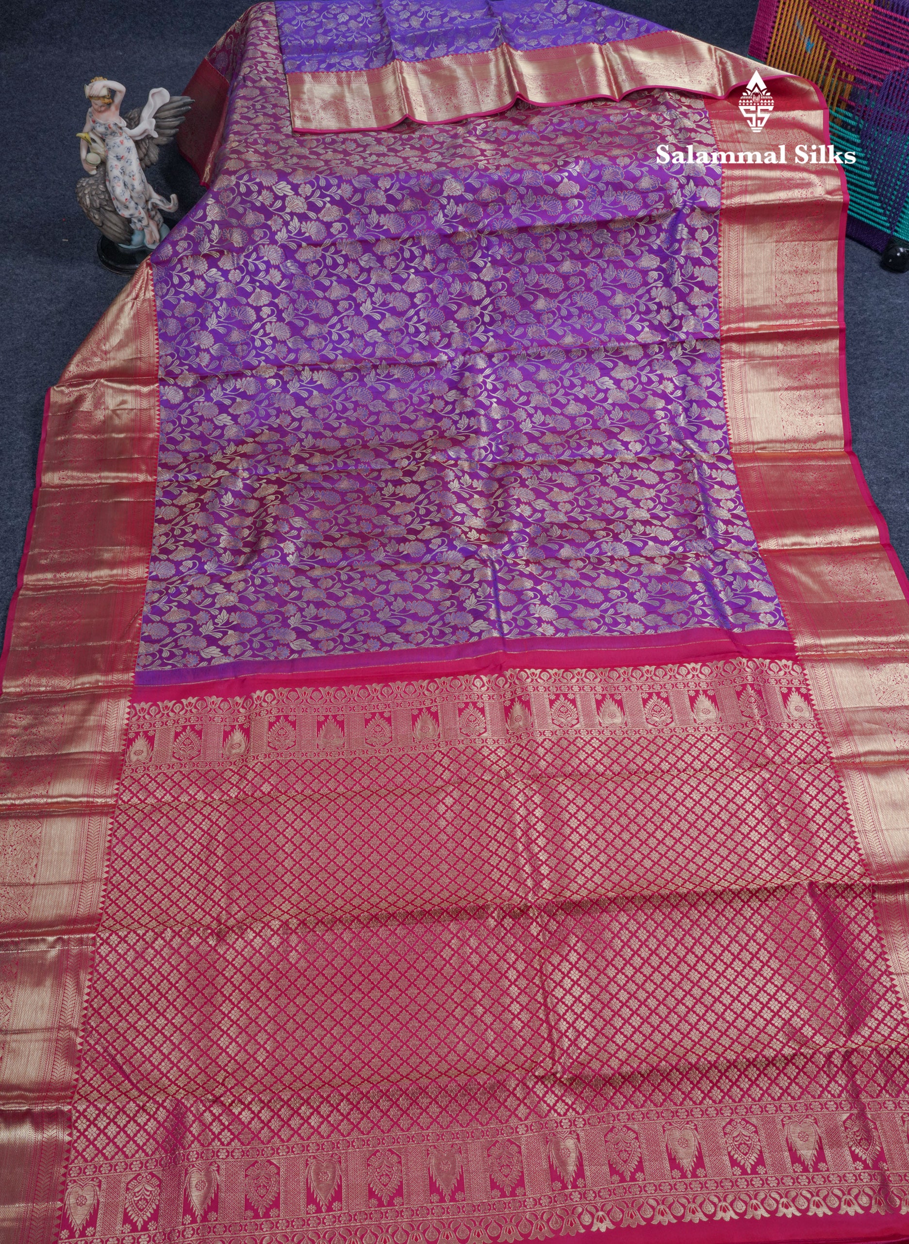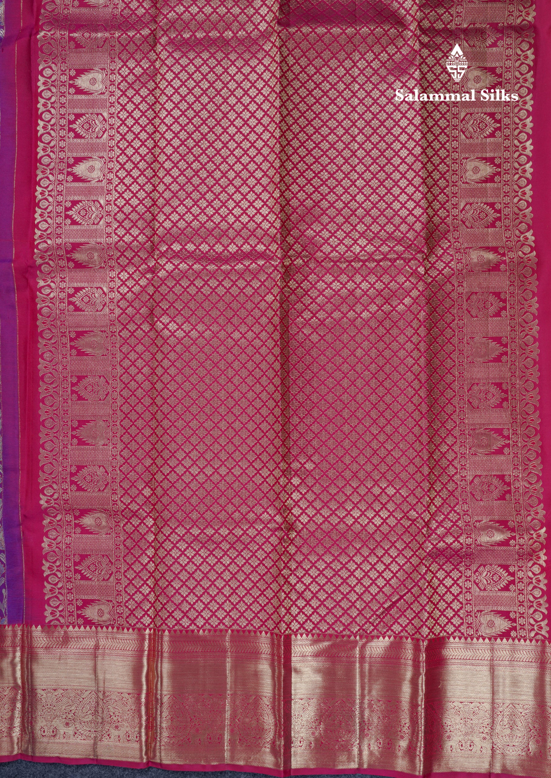 Salammal is known for its handloom sarees. In some sarees, there is cross-weaving between the body and the pallu, which is a sign of pure handloom sarees. This can be seen in Kanchipuram embossed sarees.