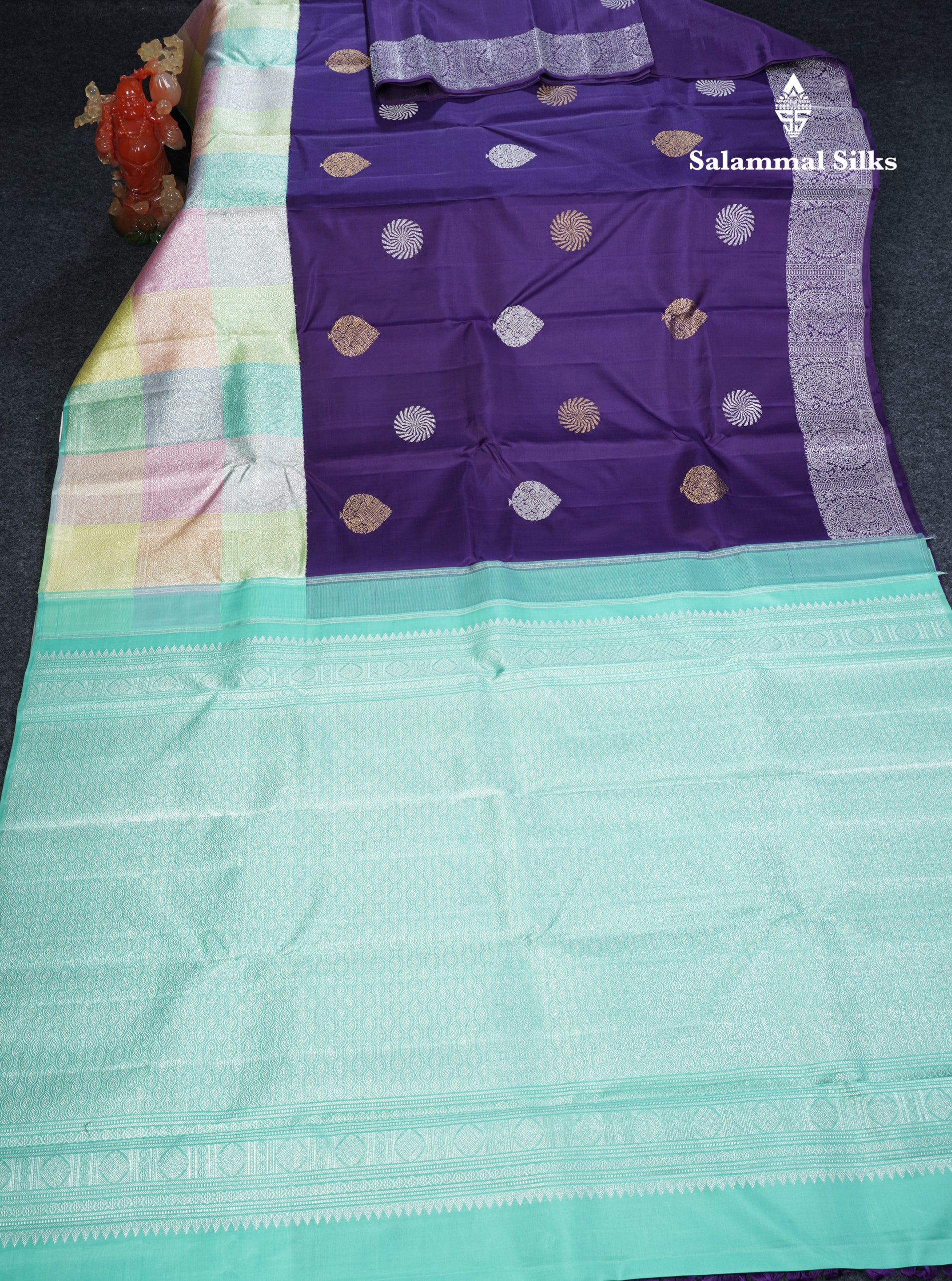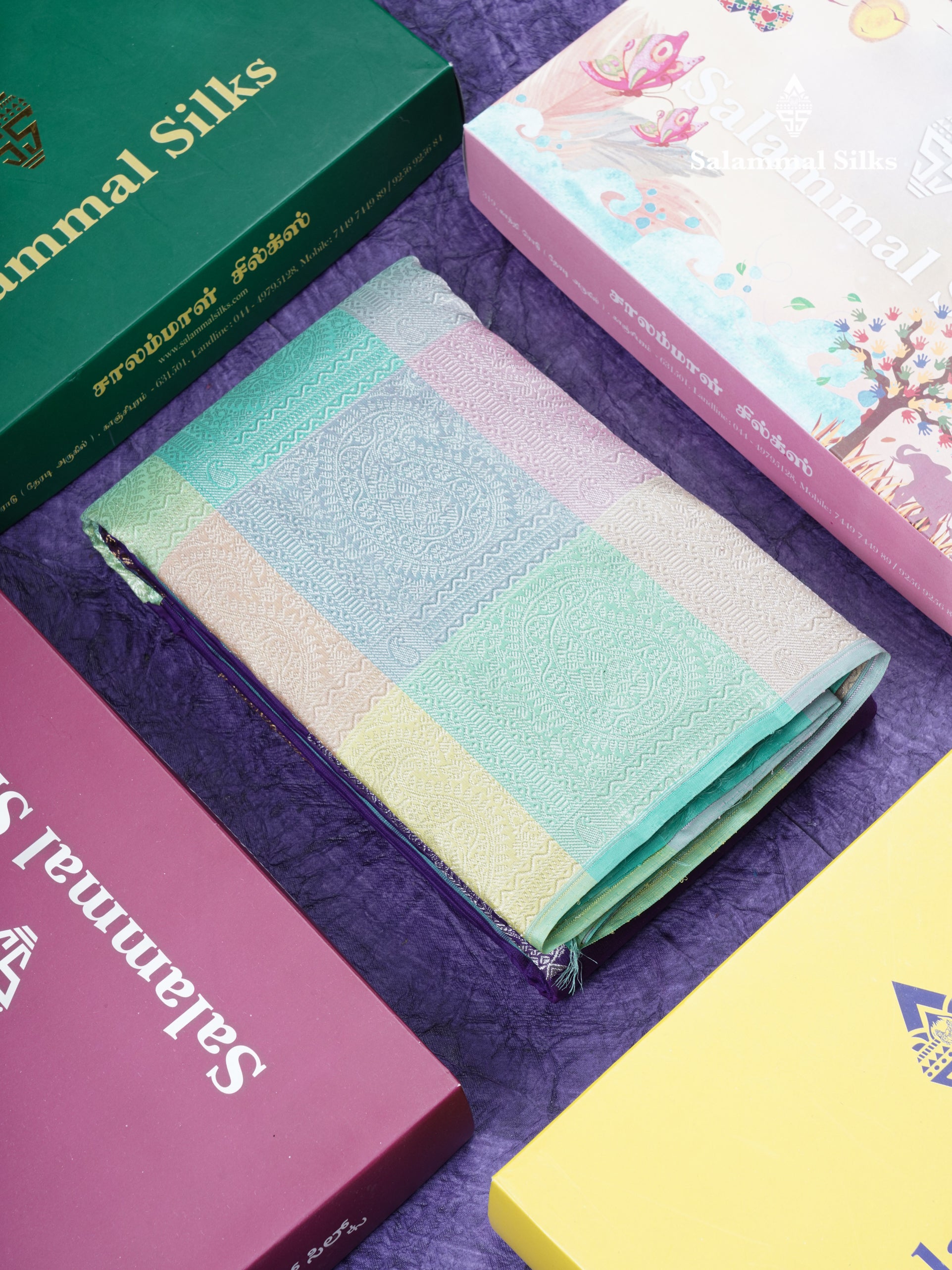 Salammal is known for its handloom sarees. In some sarees, there is cross-weaving between the body and the pallu, which is a sign of pure handloom sarees. This can be seen in Kanchipuram embossed sarees.