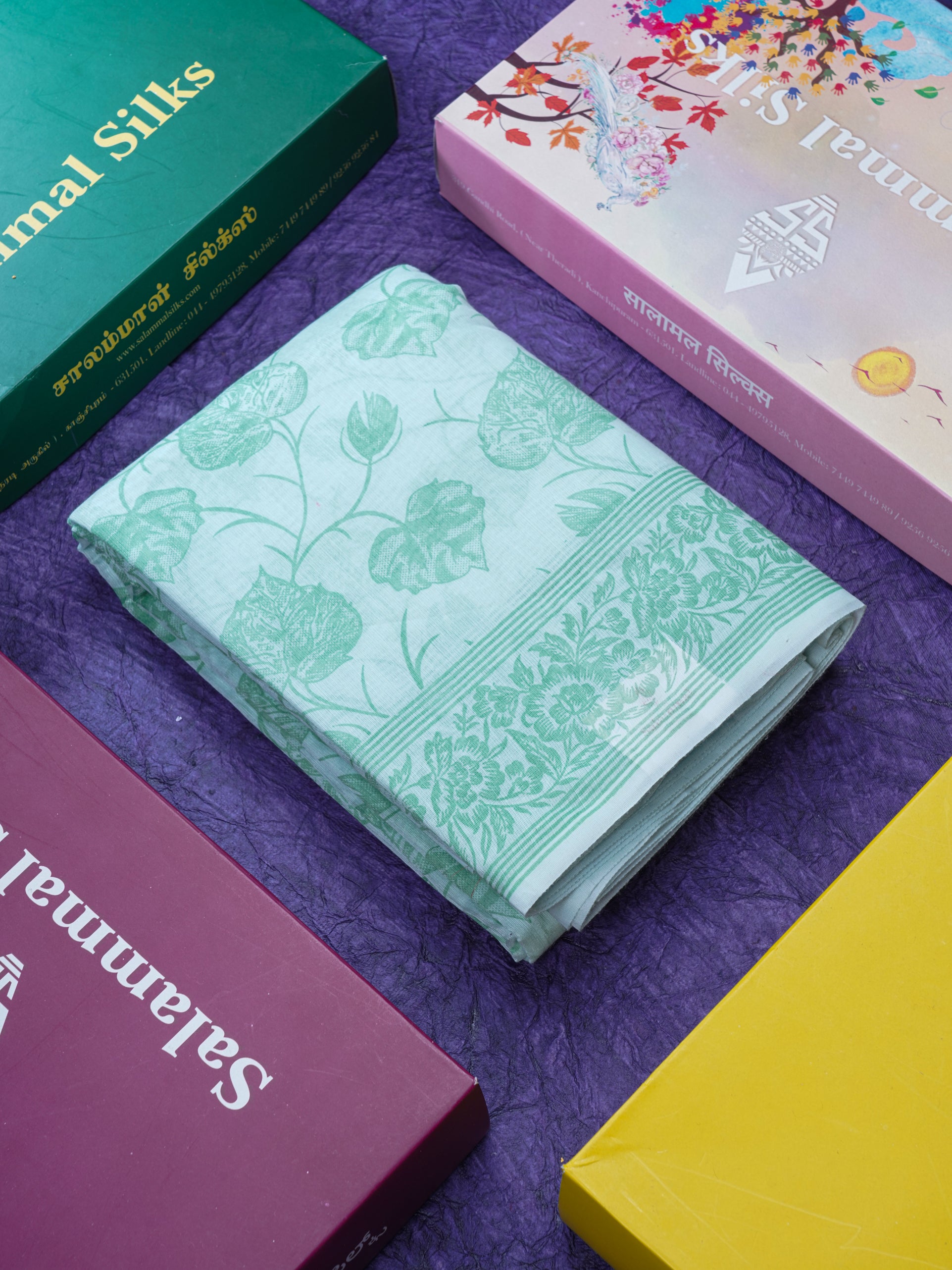 Salammal is known for its handloom sarees. In some sarees, there is cross-weaving between the body and the pallu, which is a sign of pure handloom sarees. This can be seen in Kanchipuram embossed sarees.