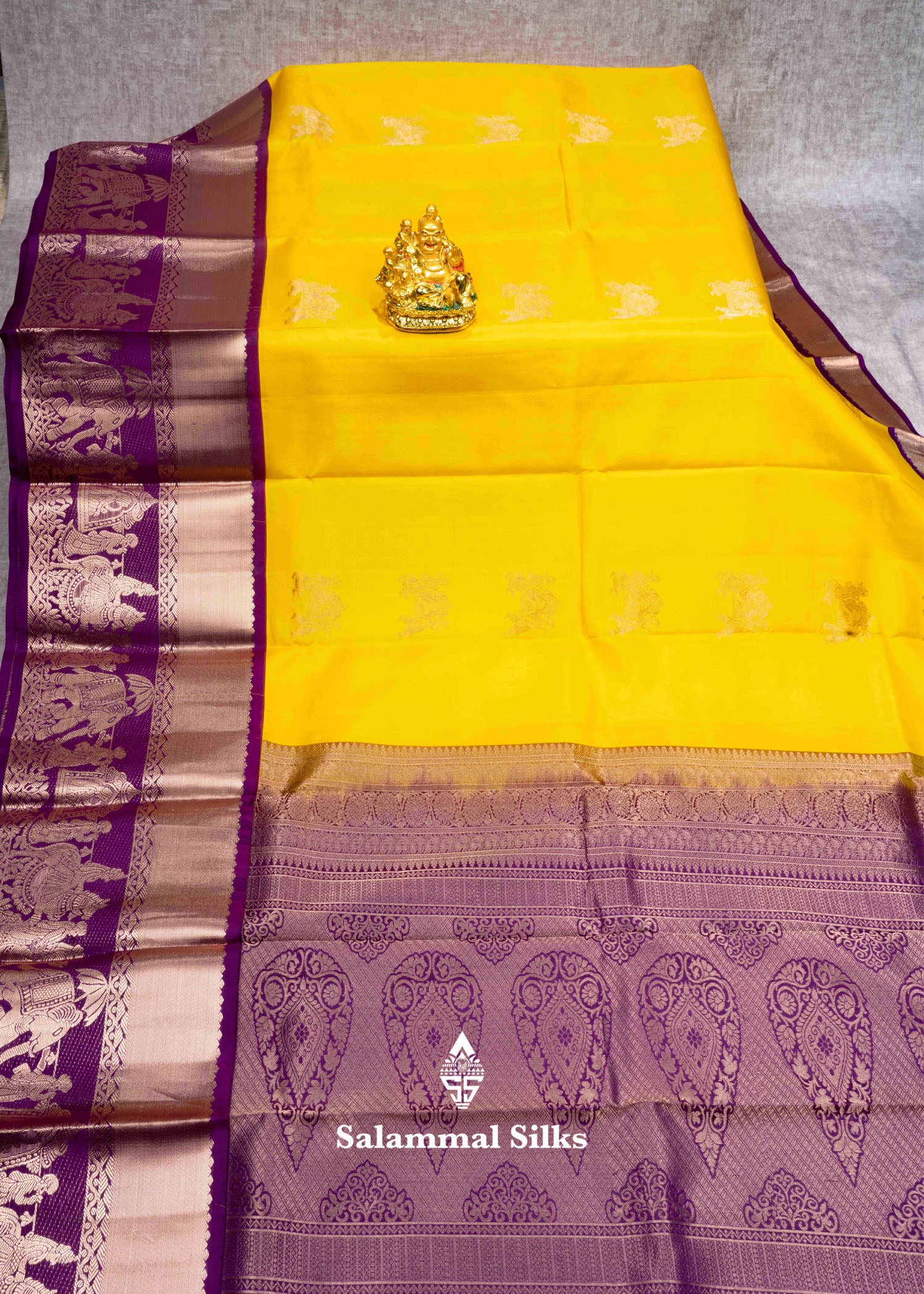 Yellow Color Kanjivaram Pure Silk Saree with Pallakku Fancy Border and Maroon Blouse