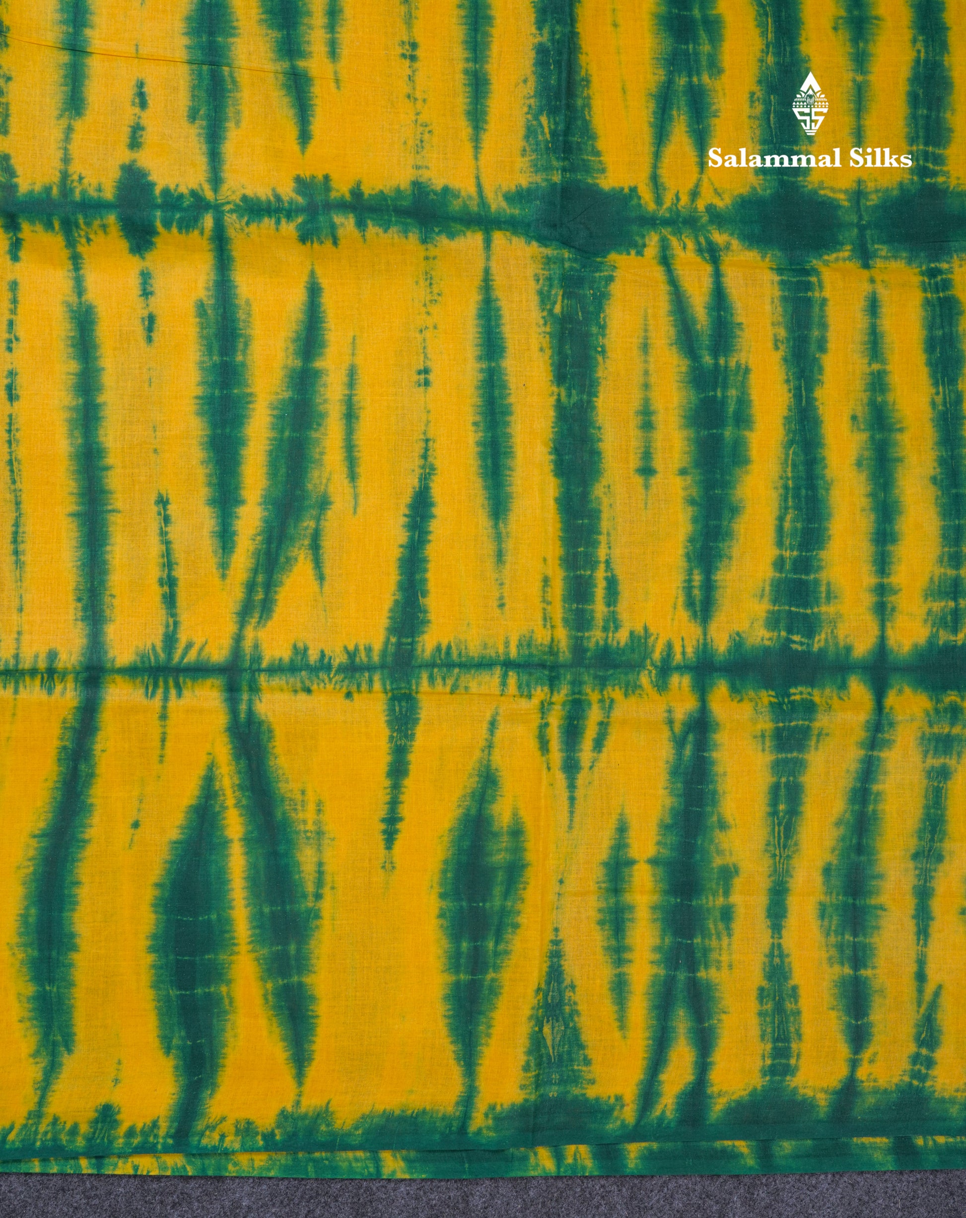 Yellow & Green Batik Print Sungudi Pure Cotton Saree With Contrast Bottle Green Blouse